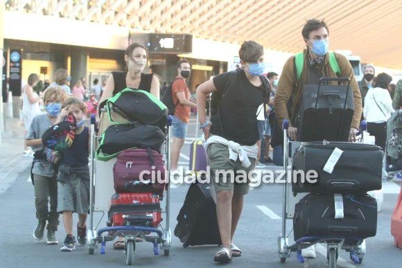 Las cámaras de Ciudad Magazine captaron su arribo al Aeropuerto de Ezeiza donde llegó acompañada de sus hijos Bautista, Benicio y Beltrán, frutos de su anterior relación con Benjamín Vicuña y su esposo, y con el mejor humor.