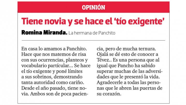 "Mi hermano es lo más. Y su felicidad es muy importante para todos... Más que nada para mi mamá que de ese modo sentiría cierto alivio de saber que los muchos esfuerzos y dolores de su crianza, han tenido sus aciertos para que hoy sea feliz. Lástima que Panchito nos hace renegar bastante con los cuidados de su salud más que nada, lo referido a su alimentación", agrega y destaca a toda la gente que lo ayuda. "Su lista de contactos del celu es interminable". Entre ellos está el de la Peña -de Boca- Azul y Oro local, que también prometió dar una mano para cumplir el sueño a Panchito, el "amigo del pueblo".