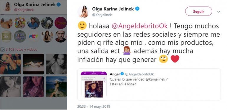 Ángel de Brito encontró la peculiar oferta y le preguntó a la protagonista por medio de Twitter en qué consistía. “¿Qué es lo que vendés? ¿Estás en la lona?”, consultó el periodista. "Tengo muchos seguidores en las redes sociales y siempre me piden que rife algo mío, como mis productos, una salida, etc", explicó ella. "Además, hay mucha inflación, ¡hay que generar!", remarcó.