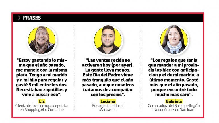 Neuquén. Con el “cocodrilo en el bolsillo”, los neuquinos gastaron menos en regalos del Día del Padre que el año pasado. Después de una semana tranquila, las ventas repuntaron ayer, con un promedio de $1500 por obsequio, un 25% por debajo de lo que se facturó en 2018. Los comerciantes esperan una oleada de clientes de último momento para hoy y hasta el mismo domingo a la mañana, como les pasó en Navidad y el Día de la Madre.