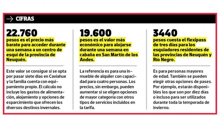 Si se suman los gastos de alojamiento, los pases diarios a los medios de elevación y el alquiler de los equipos y la indumentaria para hacer frente al clima especial de los cerros, una familia de dos mayores y dos menores que viajen a San Martín de los Andes en temporada alta deberá pagar unos $81.000 por una semana. Los mismos servicios tienen un precio similar en cerro Bayo, en las cercanías de Villa La Angostura, pero cuestan $10.000 menos en Caviahue.