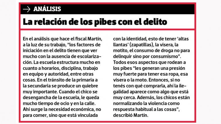 “En la actualidad, no hay buenos diagnósticos de la comarca, son lecturas muy intuitivas. La Policía es la que más conoce a los pibes y eso es un problema, porque cualquier comunidad que trabaje de manera seria con las instituciones no puede dejar que la conflictividad adolescente sea administrada por la Policía, porque la administración la termina haciendo a los golpes, lo que invisibiliza mucho la violencia institucional. Esto fortalece el resentimiento y las identidades vinculadas a las bandas. Esto, en edades donde se está formando la identidad, se termina transformando en una guerra antipolicía, por lo que es una locura entrar en eso”, concluyó Martín.
