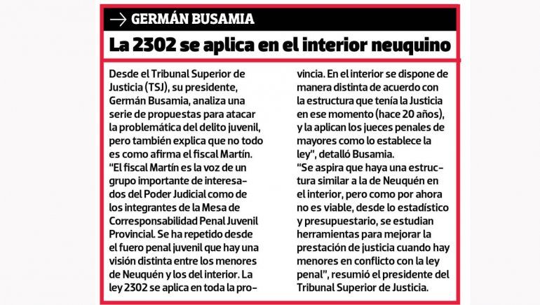 Justamente, Germán Martín disparó la polémica sobre la ley 2302 del Niño y el Adolescente, que es emblemática en la provincia y lleva 20 años, al afirmar que “la parte penal de la 2302 solo se aplica en la primera circunscripción, es de decir, de Rincón de los Sauces hasta Senillosa. Si un pibe cae en el interior de la provincia, no recibe el mismo trato que en Neuquén”.
