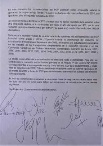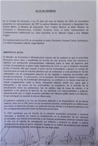 Jorge Marillán, secretario adjunto de ATE, informó que se trató de una reunión "aguerrida, porque en un principio la propuesta era un porcentaje para el primer trimestre del año del 7 por ciento" y, tras varias idas y venidas, "quedó en el acta extender por dos tramos más la continuidad de la fórmula que se venía aplicando".