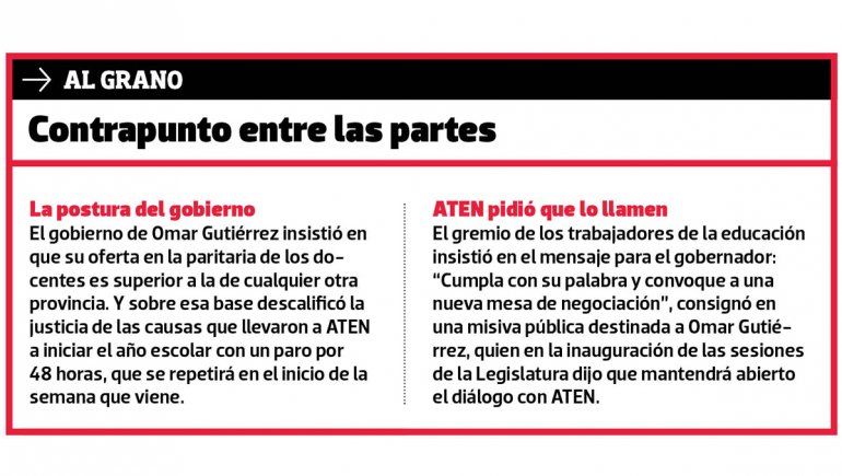 Noventa y seis coma tres por ciento contra cincuenta y uno coma siete por ciento fue el resultado de la puja verbal entre el gremio de los docentes y el gobierno de la provincia por el nivel de acatamiento al paro de los trabajadores de la educación en el inicio oficial del ciclo lectivo. Los datos globales son incomprobables para la gente, puesto que las planillas de presentismo las maneja el gobierno y la distribución territorial de fuentes la tiene ATEN.