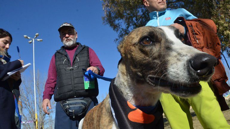 Muchos de los visitantes del Parque Animal llegaron con sus mascotas sujetas con una correa. Entre ellas estaba Pantu, un galgo bicolor que fue rescatado de un allanamiento en Cutral Co donde detectaron a tres animales que eran explotados para participar en carreras clandestinas.
