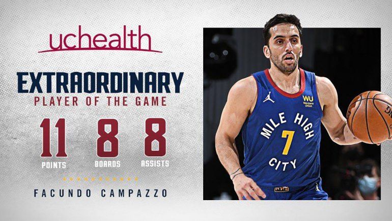 Como viene siendo habitual, el argentino formó parte del quinteto titular junto a Aaron Gordon, Michael Porter Jr, Austin Rivers y el candidato al MVP de la temporada, Nikola Jokic. En 32 minutos en cancha, Facu se despachó con 11 puntos, ocho asistencias, ocho rebotes, dos robos y un tapón, para quedar al borde de su primer triple-doble en la liga norteamericana.