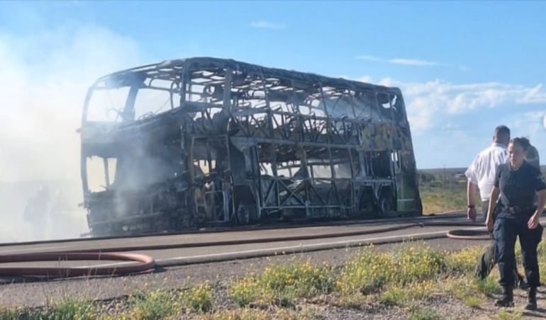 El doble piso quedó hecho cenizas cerca de Puerto Madryn. Los pasajeros evitaron una tragedia al advertir el fuego y avisarle al chofer. "Nadie nos evacuó", se quejó una mujer.