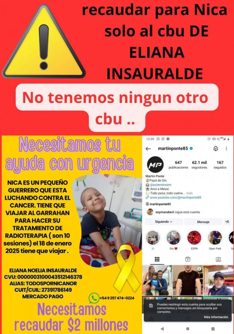 Eliana Insarrualde, mamá del nene que lucha contra el cáncer, realizó la denuncia por las redes sociales, luego de que los datos bancarios proporcionados por Ponte en la movida solidaria no correspondían a la cuenta destinada al tratamiento del pequeño, sino a una cuenta personal.