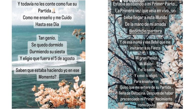 “Todavía no les conté cómo fue su partida. Como me enseñó y me cuidó hasta ese día. Tan genio. Se quedó dormido, durmiendo su siesta. Y eligió que fuera el 5 de agosto. ¿Saben que estaba haciendo yo en ese momento?”, consultó Paula Chaves a sus seguidores jugando con la intriga, luego se respondió a sí misma: “Estaba asistiendo a mi primer parto...”.
