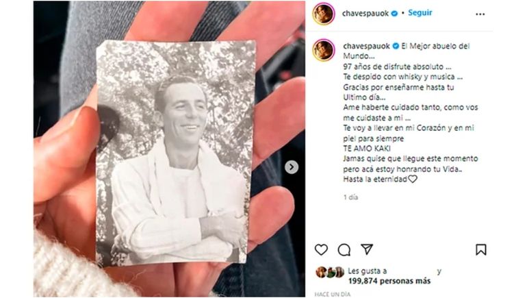 “El mejor abuelo del mundo. 97 años de disfrute absoluto. Te despido con whisky y música. Gracias por enseñarme hasta tu último día. Amé haberte cuidado tanto, como vos me cuidaste a mí. Te voy a llevar en mi corazón y en mi piel para siempre. Te amo Kaki”, escribió la conductora.