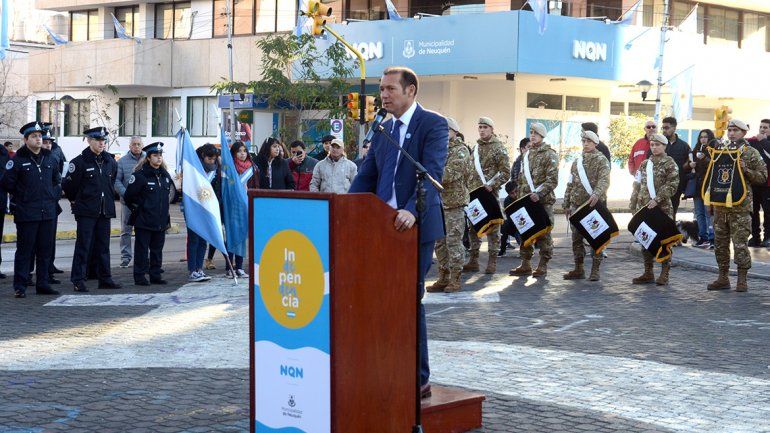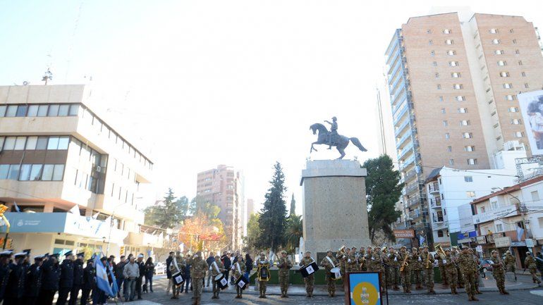 Antes de las 11 de la mañana y bajo un intenso frío, la banda del Batallón de Ingenieros fue la encargada de interpretar el Himno nacional y el Himno neuquino para que pudieran entrar en calor todos los presentes. El playón, lindante al monumento, estaba completo con vecinos y vecinas quienes dieron su presente en esta celebración.