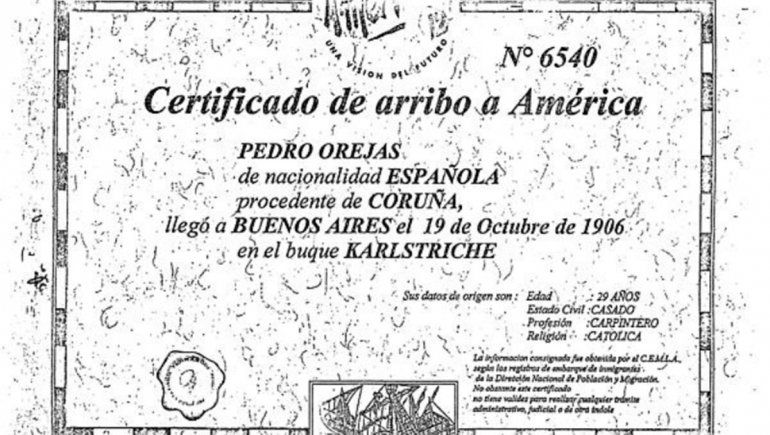 Arribaron a la Argentina en el buque Karlstriche procedente de Coruña el 19 de octubre de 1906. En el registro de embarques de Pedro Orejas constan los siguientes datos personales: nacionalidad española, edad 29 años, estado civil casado, profesión carpintero, religión católica. Con motivo de realizarse la Expo América en Buenos Aires en conmemoración de los 500 años de la llegada de Cristóbal Colón, la familia recibió el Certificado de arribo a América Nº 6540, (cuya copia se muestra en esta publicación) La información allí consignada fue obtenida por el CEMLA según los registros de embarque de inmigrantes de la Dirección Nacional de Población y Migraciones.