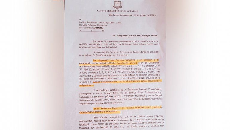 “Ingresé a la localidad porque los concejales de la oposición pedían mi presencia en la Villa. Pregunté al Centro de Salud qué requisitos necesitaba y me indicaron que tenía que traer hisopados negativos 72 horas previo al ingreso y permiso de circulación", aseguró Pellini en declaraciones a LM Neuquén.