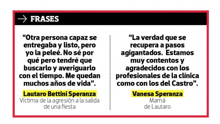 En cuanto a la intervención de la Justicia en su caso, Lautaro se muestra satisfecho. Tras sufrir la agresión por la que dos jóvenes de 18 años fueron acusados como los autores, confió: “No siento bronca pero no sé si los perdoné. A mí me parece que un tipo que le pega a otro un piedrazo en la cabeza no puede andar suelto en la calle”.