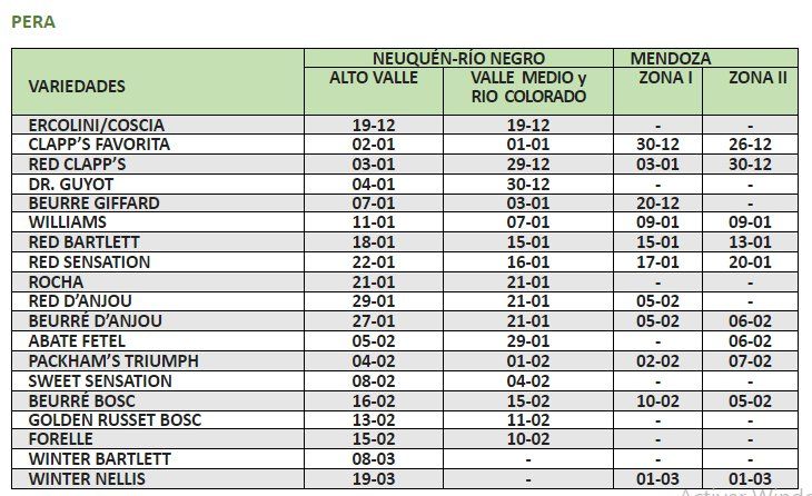 La pera Williams se podrá comenzar a levantar desde la primera semana de enero en Valle Medio, y desde el 11 en Alto Valle. Antes saldrá el sello de algunas variedades primicia.