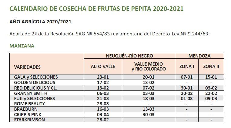 “Los adelantos de cosecha para las variedades con fecha establecida de las zonas de Alto Valle, Valle Medio y Mendoza serán analizados por las comisiones de Madurez, que elevarán al Senasa la evaluación, a fin de que éste autorice la fecha de adelanto del calendario”, se precisó.