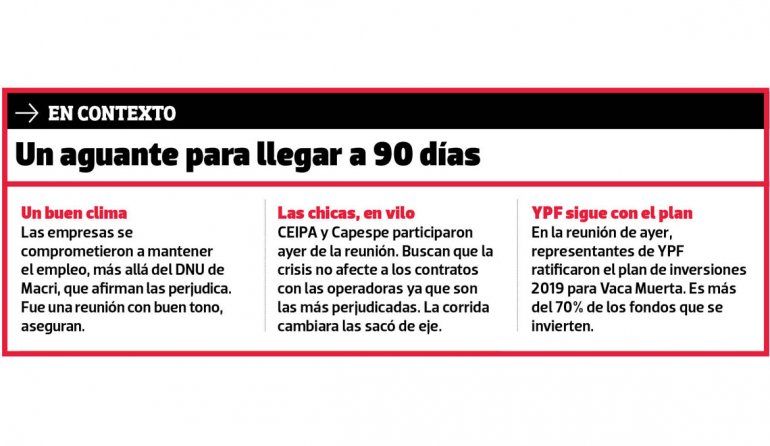 Ayer, en la Subsecretaría de Trabajo de la provincia, se reunieron representantes de las principales operadoras, con YPF a la cabeza, Pan American Energy, Vista Oil, Total y Chevron. Además, las cámaras empresariales y representantes de las pymes neuquinas.
