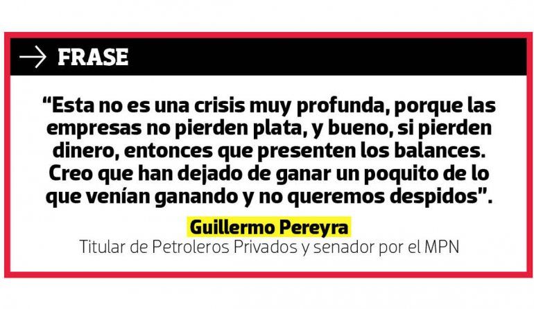 “El fondo de la cuestión es que no se tomen medidas apresuradas, que no se hagan despidos. No seamos torpes y consensuemos con las empresas para que no haya. No queremos compañeros en la calle, tengamos la paciencia y cordura para analizar cada uno de los casos”, dijo ayer Guillermo Pereyra, secretario general de Petroleros Privados, senador nacional por el MPN y hoy en plena campaña por su reelección a la banca.