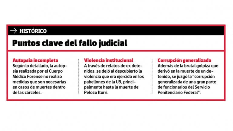 Según el relato acreditado en el documento de 525 páginas, fue trasladado por los agentes hasta la Sección Asistencia Médica, donde murió antes de llegar al hospital Castro Rendón. En principio, la autopsia decretó que había fallecido por muerte súbita, pero los testimonios de los peritos de la Corte Suprema de Justicia de la Nación y los asignados por la Procuración Penitenciaria de la Nación, pudieron “acreditar sin lugar a ninguna duda que Pelozo Iturri murió como consecuencia de la golpiza que le propinara el personal de requisa”.