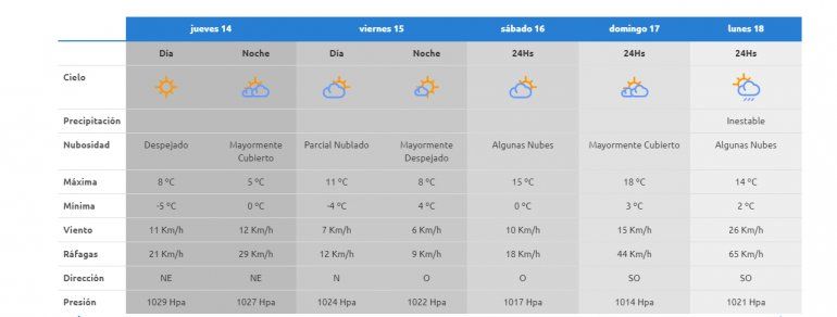 Especifica que en la región cordillerana se pueden registrar hoy nevadas débiles en alta montaña y que estará inestable en Villa La Angostura, San Martín de los Andes, Junín de los Andes y Aluminé.