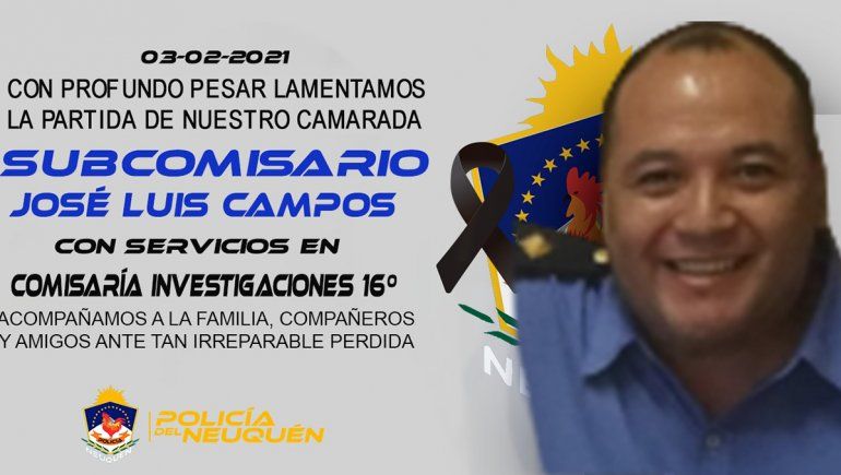 Este miércoles se conoció la triste noticia del fallecimiento del subcomisario José Luis Campos por Covid-19, luego de una semana de contraer el virus. La muerte provocó gran pesar en la Policía del Neuquén, que suma su tercer víctima por coronavirus desde que la pandemia llegó a suelo neuquino.