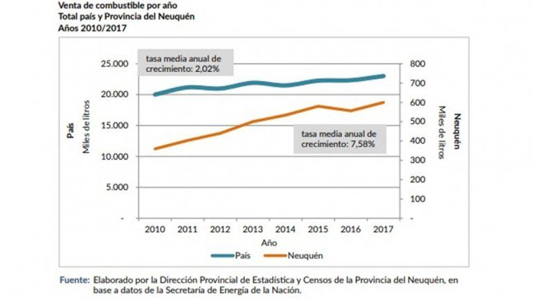 Incluso, el crecimiento a largo plazo ha sido más significativo en la provincia que a nivel nacional. En el período 2010-2017, la venta de combustibles presenta una tasa media de crecimiento de 7,58 por ciento en Neuquén, cuando a nivel nacional el promedio sólo ronda el 2,02 por ciento.