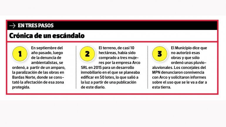 Las tierras pertenecen a la empresa Arco SRL, que las adquirió en abril de 2015 por un valor de $3 millones. Según costa en la escritura, la firma pretendía subdividir esas casi 10 hectáreas en 50 lotes, razón por la cual se habían realizado trabajos que comprendían algo más que las obras pluvioaluvionales, consistentes en azudes, autorizados por la Municipalidad.
