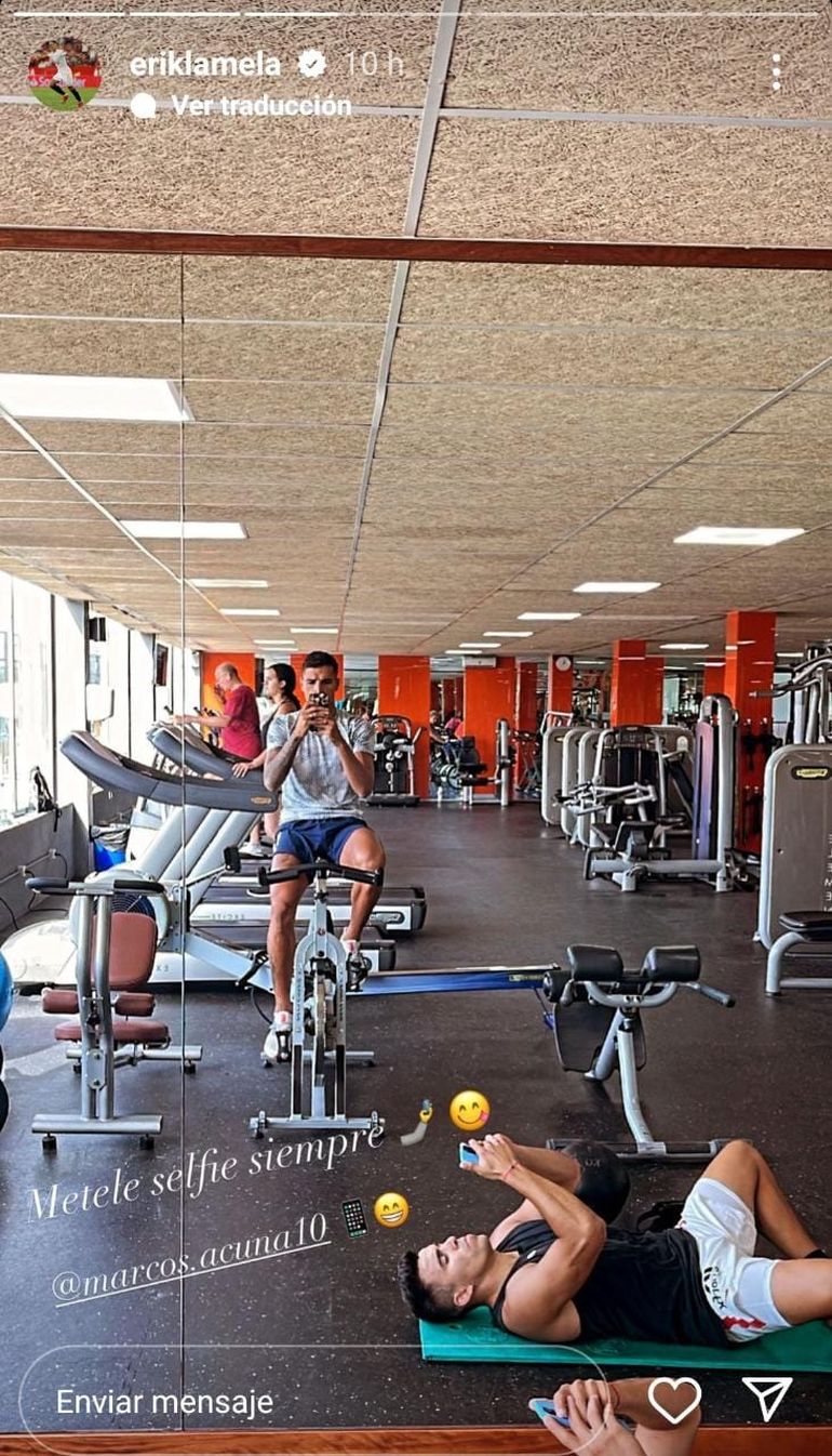 Mientras Lamela está subido a una bicicleta estática, Acuña se encuentra sobre una colchoneta durante un descanso de su ejercicio mirando su celular. Más tarde, el delantero volvió a compartir un video en sus redes sociales, pero esta vez, estaban disfrutando de la plata jugando con la pelota, tomando mates y comienzo facturas.