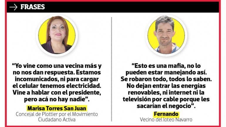 Al grito de “¿dónde está el presidente (de la cooperativa)?” y “esto es una barbaridad”, el grupo de vecinos hizo sentir su enojo sobre la calle Libertad. Para ellos, lo peor es que aunque al final el servicio fue repuesto durante la siesta de ayer, no tienen certeza sobre cuándo puede producirse otro apagón.
