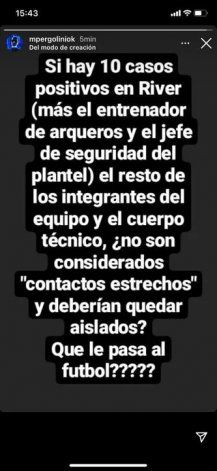 "Si hay 10 casos positivos en River (más el entrenador de arqueros y el jefe de seguridad del plantel) el resto de los integrantes del equipo y el cuerpo técnico, ¿no son considerados "contactos estrechos" y deberían quedar aislados? Que le pasa al fútbol?", aseveró el ex dirigente mediante su cuenta de Instagram.