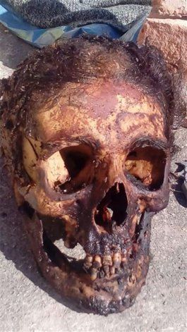 En las imágenes se puede ver a un hombre posando junto al cráneo de una persona, que había sacado de un féretro para realizar una reducción del cuerpo en el cementerio local.