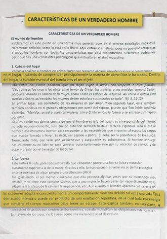 Por otro lado, en el texto difundido en las escuelas Pías de Córdoba se resalta "la fuerza física del hombre" por sobre la de la mujer.