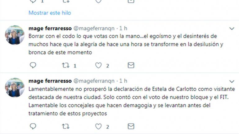 Ferrareso lamentó el rechazo de la iniciativa y acusó de forma implícita a Baggio y Zúñiga por retirarse antes. "Lamentable los concejales que hacen demagogia y se levantan antes del tratamiento de estos proyectos", expresó la concejala -aunque aclaró que no duda de su "honestidad intelectual"-. Y agregó que los mismos concejales que aplaudieron a las madres de Plaza de Mayo Alto Valle "posteriormente rechazaron la declaración de visitante de Estela", en referencia a los ediles de Cambiemos.