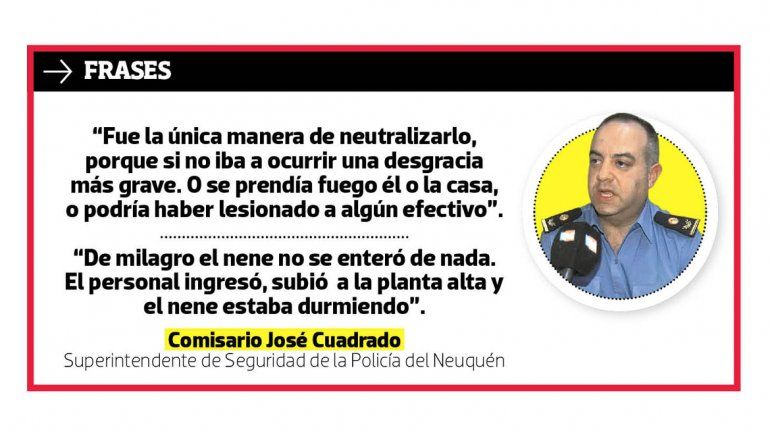 “Estaba descontrolado. Dijo que estaba jugado, que iba a prender fuego la casa con él y su hijo adentro. Por lo que el grupo especial lo hirió en las piernas para poder arrestarlo”, sentenció Cuadrado. El agente fue trasladado al hospital local, donde fue intervenido. Está fuera de peligro con custodia policial. Ahora la Justicia deberá investigar. Asimismo, se inició un sumario administrativo interno y fue separado del cargo mientras dure la investigación.