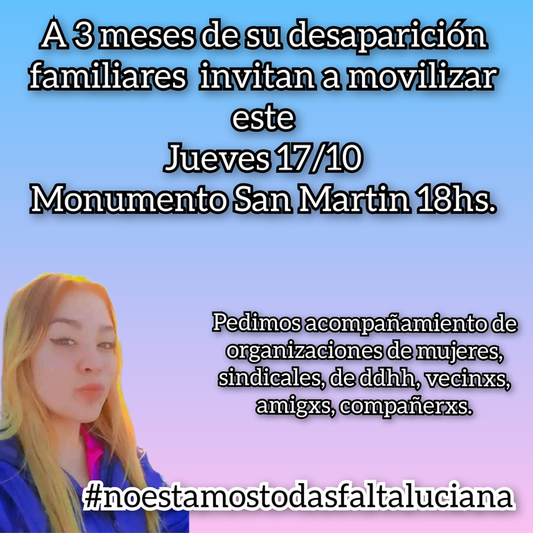 La familia de Luciana, compuesta por su mamá, su abuela materna y otros familiares, aseguró: "Vamos a seguir luchando para seguir buscándola" y pidió el acompañamiento de las organizaciones de mujeres, sindicales, de derechos humanos, vecinos, amigos y compañeros de clases para marchar en horas de la tarde.