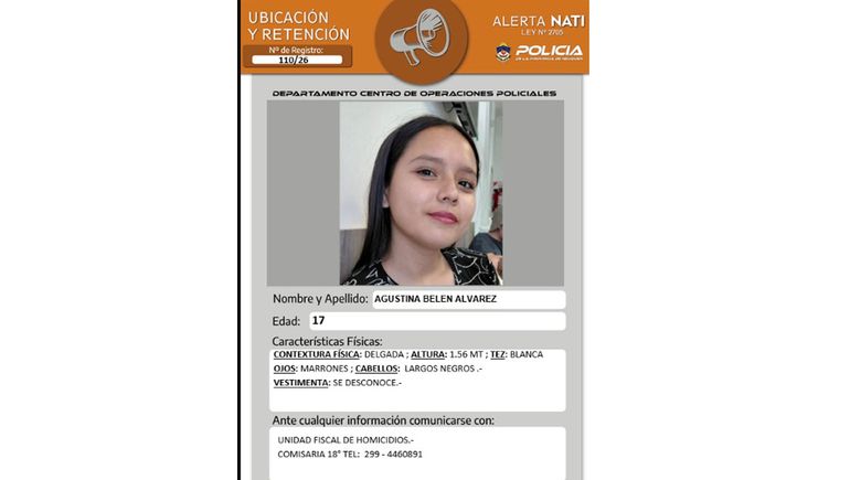 Según confirmaron, se trata de la adolescente Agustina Belén Álvarez, de 17 años, quien desapareció el jueves 26 de febrero en la cuidad de Neuquén.