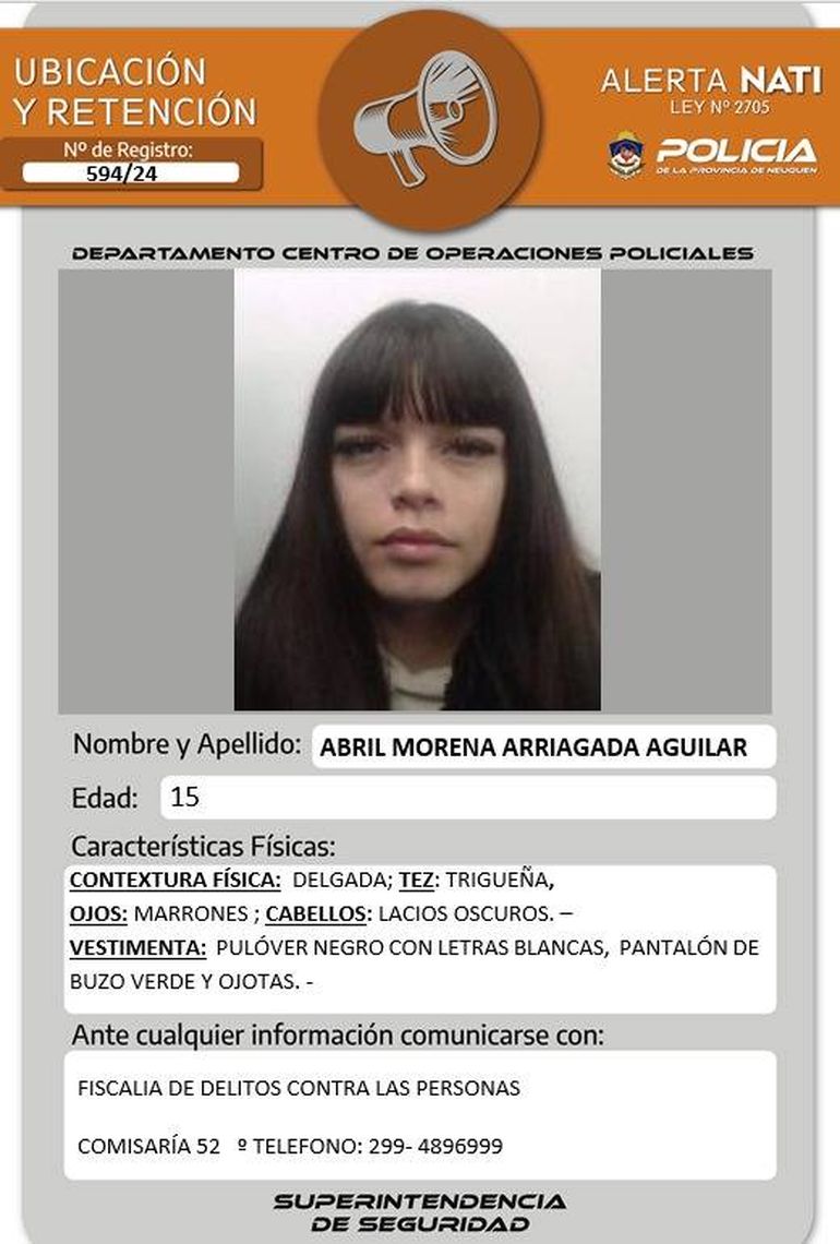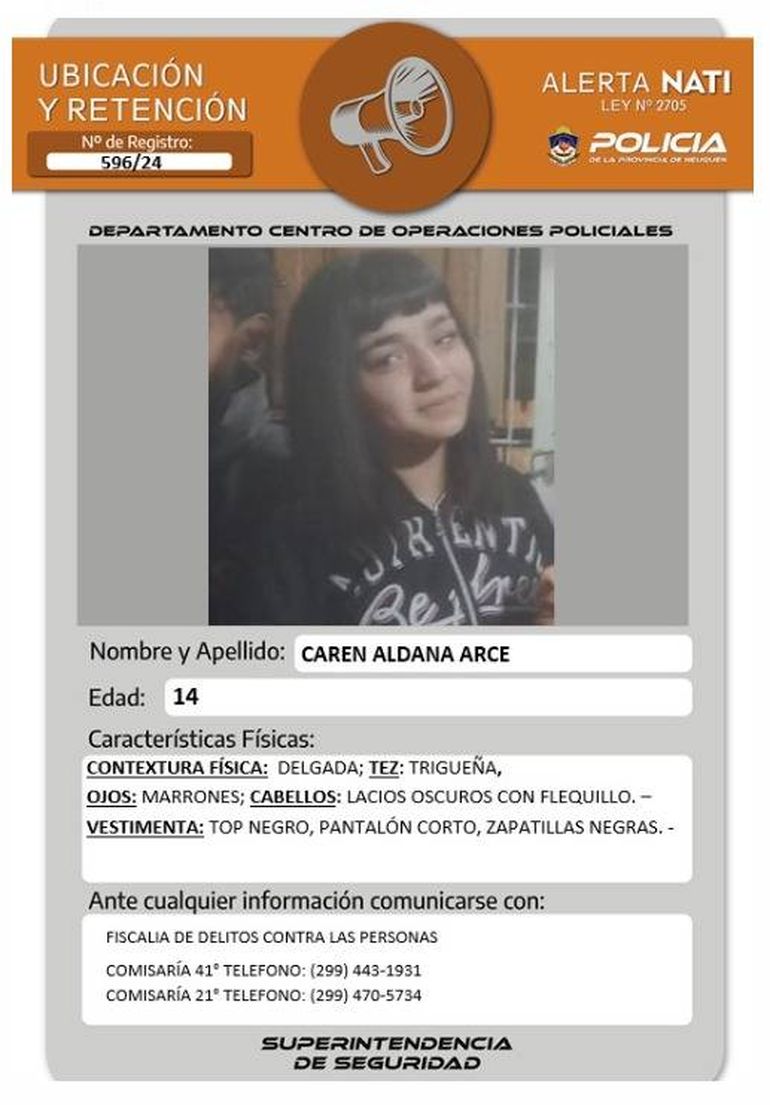 La segunda adolescente que busca la Policía de Neuquén es Caren Aldana Arce, de 14 años. La chica es de contextura física delgada, tez trigueña y ojos marrones, cabello oscuro, largo y con flequillo.