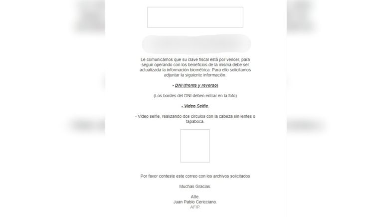 "Le comunicamos que su clave fiscal está por vencer, para seguir operando con los beneficios de la misma debe ser actualizada la información biométrica. Para ello solicitamos adjuntar la siguiente información", reza el correo electrónico, para luego solicitar fotos del "frente y reverso" del DNI de la persona y un "video selfie" realizando una rotación de cabeza, "sin lentes ni tabapoca".
