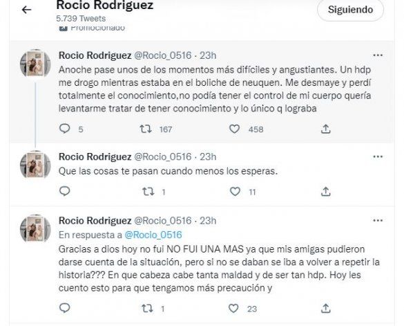 “Anoche pasé unos de los momentos más difíciles y angustiantes. Un hdp me drogó mientras estaba en el boliche de Neuquén. Me desmayé y perdí totalmente el conocimiento”, relató con crudeza en su cuenta social lo que vivió en la madrugada del sábado.