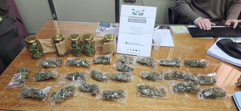 En presencia de testigos, los uniformados abrieron la caja, en la que detectaron cinco frascos y 23 sobres transparentes con un total de 1 kilo 448 gramos de cannabis sativa, de marihuana.