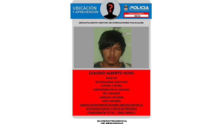 La Policía de Neuquén emitió un pedido de ubicación y aprehensión para dar con el paradero de Claudio Alberto Acho, un hombre de 26 años, en el marco de una investigación en curso.
