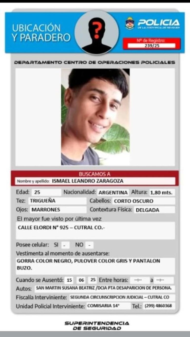 La Policía de la Provincia del Neuquén emitió un alerta de ubicación y paradero para dar con Ismael Leandro Zaragoza, un joven de 25 años que fue visto por última vez en la ciudad de Cutral Co el pasado 15 de junio. Desde entonces, su familia no tiene noticias sobre su paradero y se inició una investigación para dar con él.