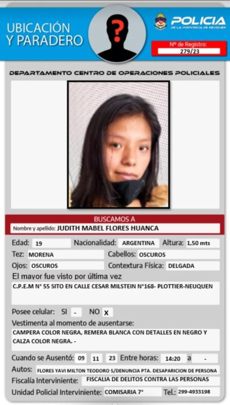 De acuerdo a la información brindada desde el área de Prensa de la Policía del Neuquén, Judith Flores Huanca, de 19 años, fue vista por última vez en el CPEM N°55 de la ciudad de Plottier el jueves 9 de noviembre, alrededor de las 14. Esa fue la información que aportó un familiar de la joven al momento de denunciar su desaparición en la Comisaría Séptima de Plottier.