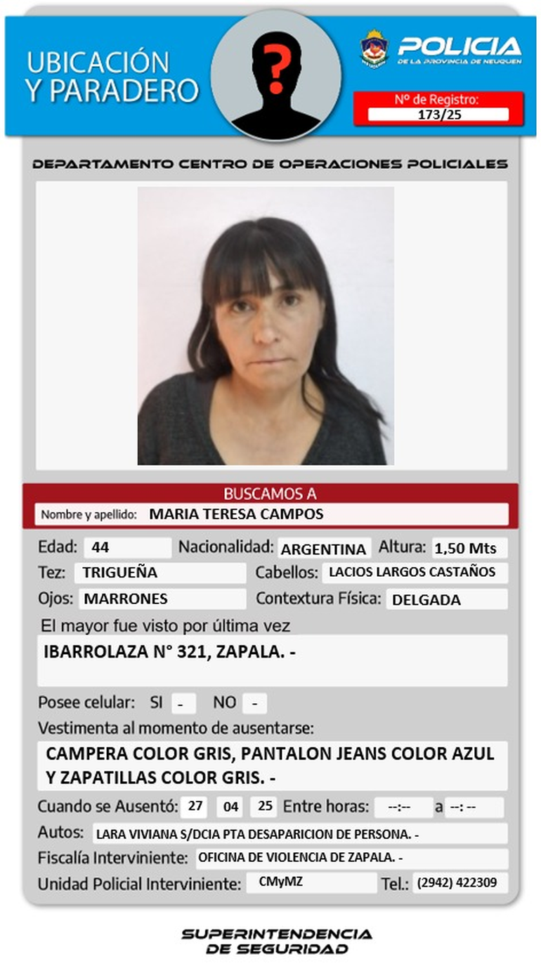 La fiscalía interviniente a cargo de su desaparición es la Oficina de Violencia de Zapala. Ante cualquier información se solicita comunicarse al (2942) 422309.