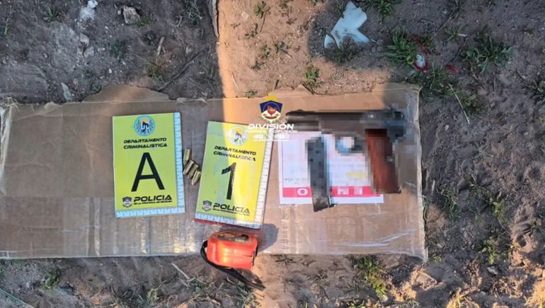 Una vez iniciadas las diligencias en la casa del barrio Colonia Rural Nueva Esperanza, los efectivos lograron encontrar al presunto autor de las amenazas calificadas. En el lugar allanado pudieron secuestrar el Gol en el que circulaba. También se pudo secuestrar de un arma de fuego tipo carabina con cargador completo, dos caños de gas oxidados en forma de T tratándose presumiblemente de un arma de fabricación casera, conocida como tumbera -con la que habría realizado las amenazas- y un cartucho completo de munición múltiple.