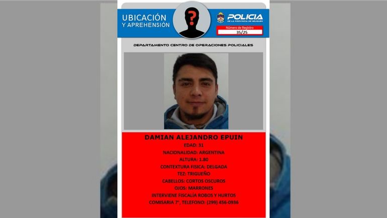 Luego de avalar el pedido de la Fiscalía de Robos y Hurtos le formuló cargos a Epuin por el delito de robo simple en grado de tentativa, el juez interviniente dictó la domiciliaria con rondines sorpresivos en una vivienda de Plottier. Pero Epuin no tardó en volver a sus andanzas: esta semana, los efectivos policiales ya no pudieron dar con él en su vivienda y su familia negó conocer su paradero, por lo que la Justicia ordenó el pedido de captura en las últimas horas.