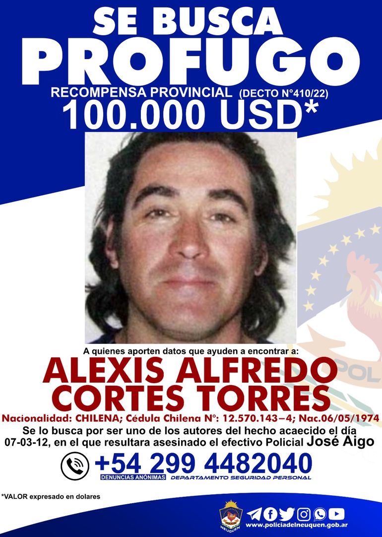 Se supo que Interpol está pronto de renovar el código rojo de búsqueda de Salazar Oporto y Cortes Torres y la recompensa que se ofrece desde Neuquén es de 100 mil dólares, más otros 5 millones más que ofrece Nación.