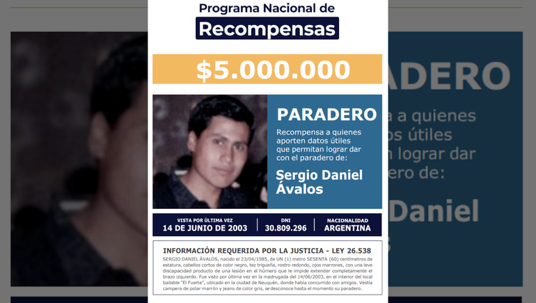 El Ministerio de Seguridad de La Nación hizo público mediante el Boletín Oficial el aumento de la recompensa para quienes aporten datos sobre la desaparición de Sergio Ávalos. El joven estudiante de la Universidad Nacional del Comahue fue visto por última vez en el boliche Las Palmas de la capital neuquina el 14 de junio de 2003. Tenía 18 años.