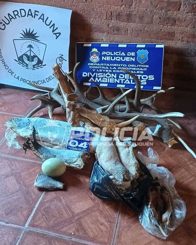 En el interior del inmueble también se hallaron numerosos restos de animales de fauna silvestre faenados. Según se informó oficialmente, se secuestraron ejemplares de piche, truchas, carpa, astas de ciervo, partes de jabalí, dos choiques y un huevo de choique entero, además de redes de pesca. Varias de estas especies se encuentran protegidas por la legislación nacional y provincial, lo que agrava la imputación.